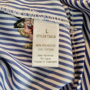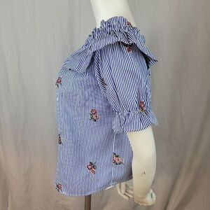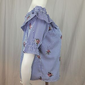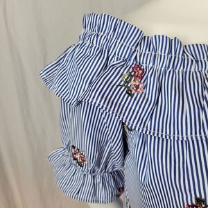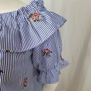 Pretty blue & white vertical striped on or off the shoulder top with embroidered flowers!