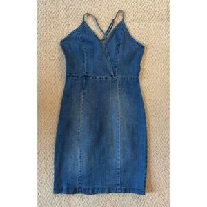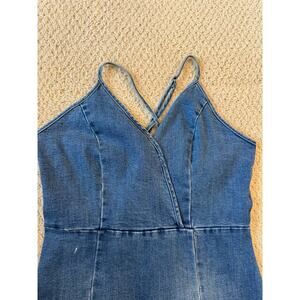 Features/Description: V-neck jean dress. Straps cross in the back and are adjustable. Dress also has a zipper in the back.