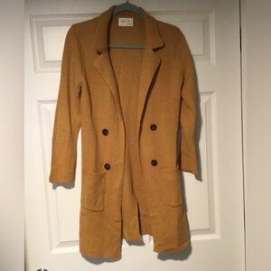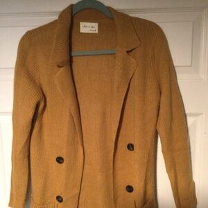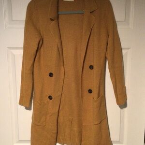 Stylish mustard Active USA knit cardigan sweater will get you ready for fall and winter. Features front pockets and long sleeves. Measures approximately 18 inches from under arm to under arm and is approximately 25 inches under arm to the bottom of the cardigan. such a cute sweater in excellent condition fabric is 88% acrylic 10% and 2% polyester.