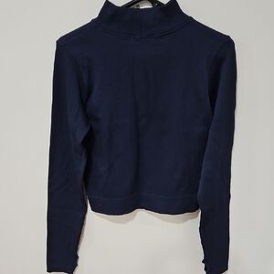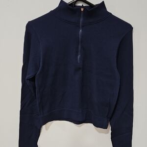 Stylish navy long sleeve top. Features a half-zip design. Perfect for casual wear.