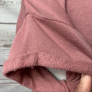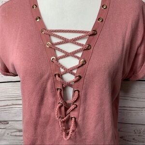 Oversized need not be boring or bummy wearing this modern cute lace up tee that still provides that chill comfort with a terry knit blend.