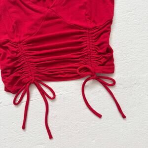 this red ruched drawstring crop top features adjustable drawstrings that let you tailor the front length and silhouette. soft stretchy knit fabric with double lined bust ensures coverage while flattering the figure. perfect for warm-weather layering, casual street looks, or summer nights out.