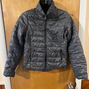 Selling a Women's Grey Bubble Jacket, in a size Small. It has a zipper closure, long sleeves, two pockets in the front, "YB" on the left chest, and a mock neck, which reads "Boss Lady" along the back. Made of Polyester and Nylon. There is a small thread missing near the left pocket (shown in the last picture). It's in otherwise Great Condition!