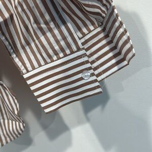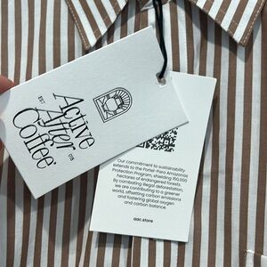 This casual streetwear brand active after coffee creates a button-down shirt features a classic design with vertical stripes in white and soft mocha brown, offering a timeless look.