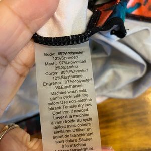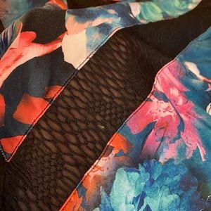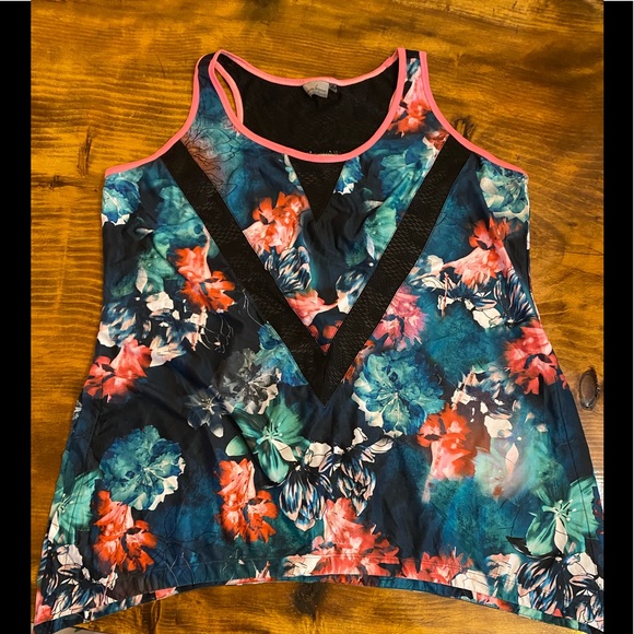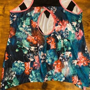 Active top, floral design, worn once, 1X, cut out in back, sheet accents, 88% polyester 12% spandex, clean, non smoking
