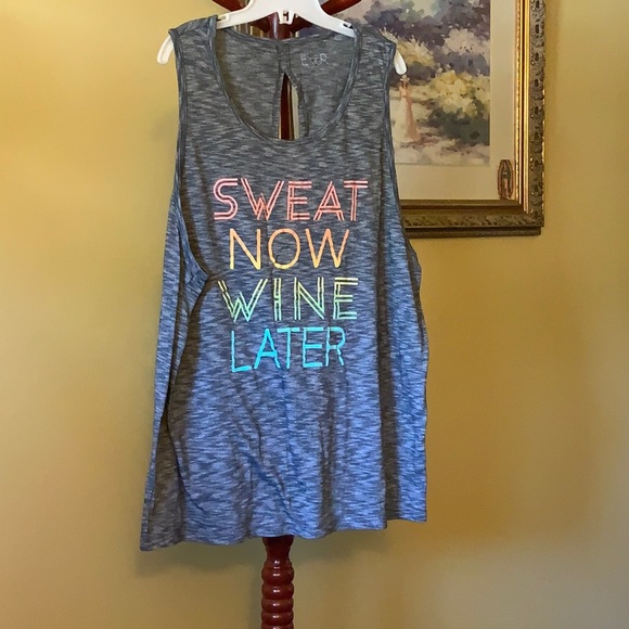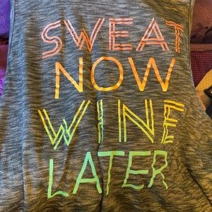 Great active top with colorful letters that say sweat now and wine later and I slit down the back