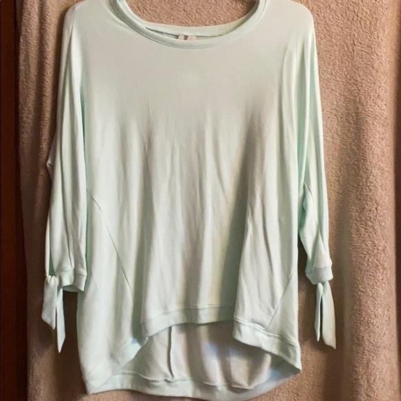Has cut off on shoulders and bottom of sleeves with ties. The color is Mint.