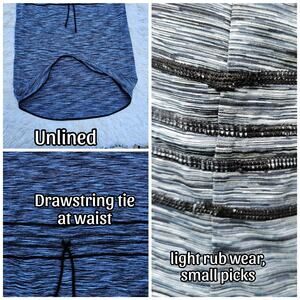 Blue/black & gray space dye stretch quick dry nylon blend fabric. Pullover style, scoop neck, sleeveless tank top style, drawstring tie at waist, rounded bottom hem, unlined. Issue noted in photos. Very good preowned condition, overall. Size Medium by Athleta. Style: Paddle Out Dress.