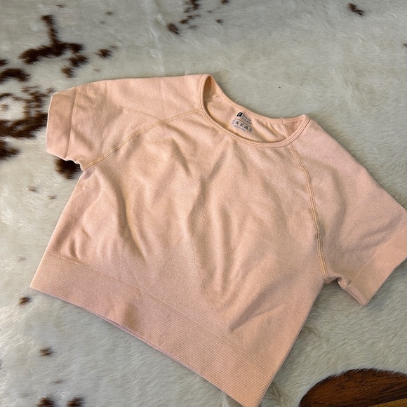 Such a fun color! The lighting doesn't do it justice here - it is more of a neon peach. Great for any activity, beautiful shaping around the chest (pictured), and gives an added bit of coverage + support over your sports bra.