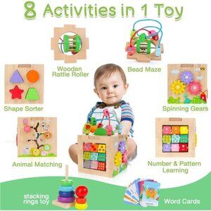 🧿【8 in 1 Activity Cube】Our multi-functional baby activity cube toy includes 8 games.The toys for 1 year old contains bead maze, rattle roller, shape sorter, spinning gears, 4 animal matching, 1-9 number pattern learning. Separately includes with bonus 12pcs word cards and a small stacking rings toy for 18m+ toddlers. Keep your babies and toddlers busy!