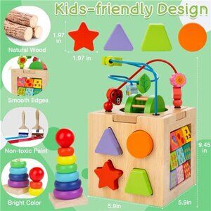 🧿【Safe for Babies】The wooden activity cube toddler toys age 1-3 are made of high-quality natural wood, bright colors are non-toxic water based paint. Smooth edging around all sides of the cube and blocks, so no worries about baby getting a splinter. Perfect shape and size for little hands.
