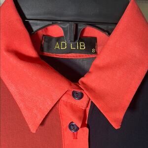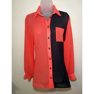 Stand out in this unique Ad Lib shirt dress, designed in a striking coral pink and deep navy blue colorblock pattern. Crafted from lightweight sheer fabric, this longline button-down is versatile enough to wear as a dress, a tunic over leggings, or even as a chic layering piece. The high-low hem and chest pocket give it a modern, fashion-forward vibe.