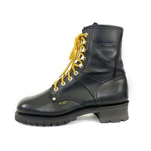 These NWOT AdTec Leather Logger Boots are 9-inch work boots made with black crazy horse leather and a Goodyear welt construction. They have a soft toe and an oil-resistant lug outsole. They feature a thick raised rubber heel, water-resistant leather, and a cushioned footbed.