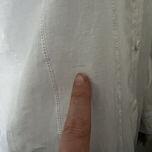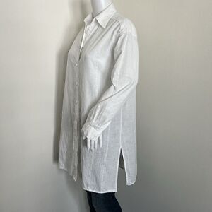 EUR Women's Size 40 Oversized white lagenlook style long sleeve linen blend tunic length top with collar. Good condition, it does have a few marks on the fabric in some places. I have pointed them out for you. Please see pictures for details. Shoulder | 19 inches seam to seam straight across back of the top Sleeve | 24.5 inches center back of the top to the end of the cuff Length | 34 inches center base of the back of the collar to the end of the top Chest Circumference | 21.5 inches x 2 = 43 Please note that color may vary a small amount because of my lighting. If you have questions please ask and I would be happy to help! -Michelle