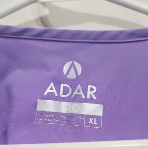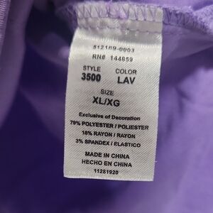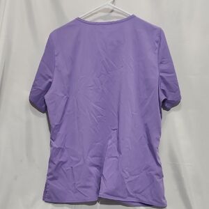 Stylish purple blouse with V-neck. Features handy pockets and short sleeves. Perfect for workwear.