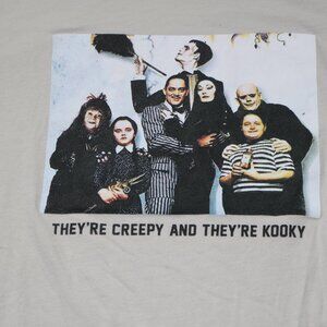 Embrace a quirky style with this beige graphic short sleeve tee. Halloween themed Adaams family graphic tee.