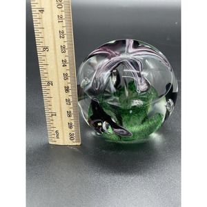 Beautiful, purple floral and green leaf glass paperweight signed with what appears to be the initials A.J. there is a very small scuff in one spot that was hard to picture but overall it is in very good condition.