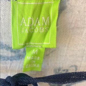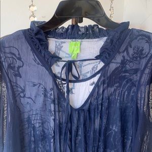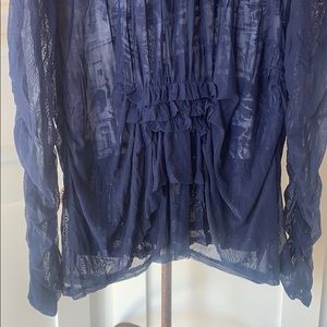 Super cute body is navy blue sheer fabric over printed fabric. Has layered look. Sheer long gathered detail sleeves. Ruffle around neck with tie and 5”V neck. Gathers down sides. Neat and different style top! Gently worn good condition