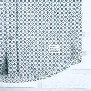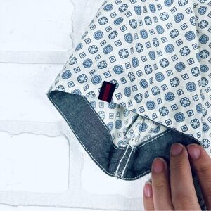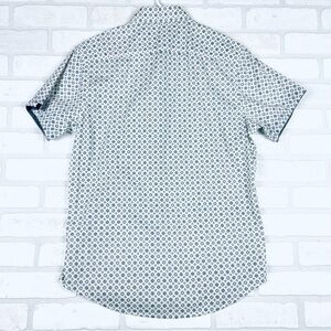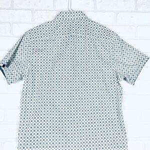 Adam Levine Collection Collared Button-up Shirt, White & Blue, Size Small. Excellent Preowned Condition. stylish with extra design touches with grey strip inside sleeves and front has label sewn on. Unique and life the extra touches for extra style. 21” chest, 27.5” length. #907 4.5