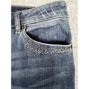 ✔ Embroidered details: lips, heart, script “trouble maker” and feathers ✔ Comfortable blend for all-day wear ✔ Distressed patches + trendy medium wash ✔ Classic 5-pocket construction, button & zip fly closure