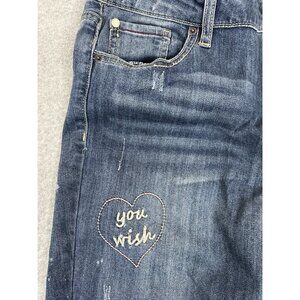 Step into style with these Adam Levine “You Wish” skinny jeans, designed with standout embroidered details. Featuring distressed accents, red lips on the back pocket, and “You Wish” stitched in a heart design on the front,"Troublemaker" script around one front pocket and small embroidered feathers on front on one side- these jeans add bold personality to any casual outfit.