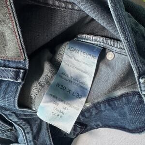 Adam Levine “The Tishomingo” men’s jeans in size 30x32100% cotton. Medium-dark wash denim with whiskering and front distressing. Five-pocket construction, button-and-zipper fly, and sturdy denim feel. Cuffs show some fraying and wear.