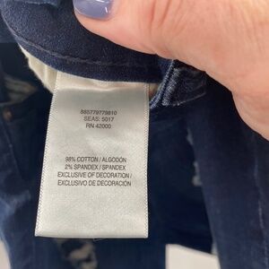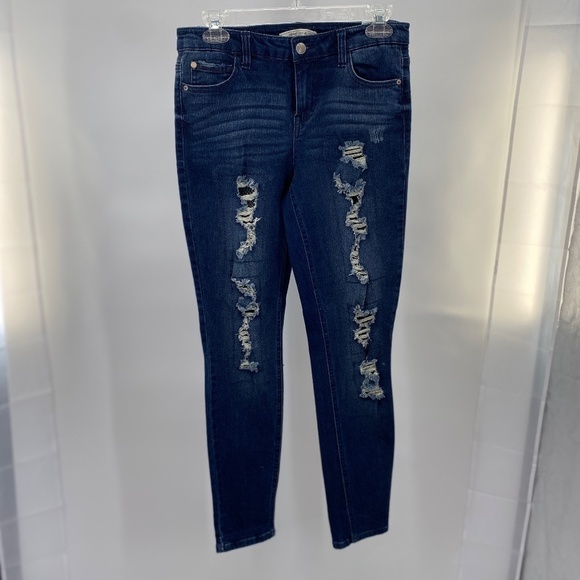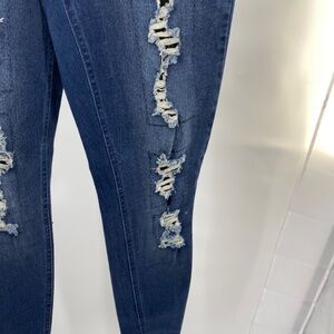 Heavily distressed jeans front of pant. Tape Measurements Waist 28” Rise 9.5 Inseam 29” Gently worn