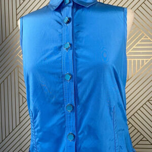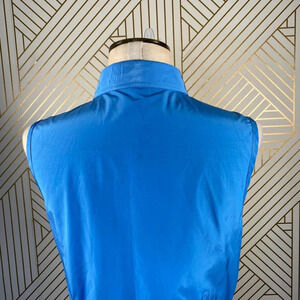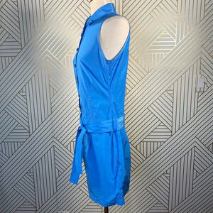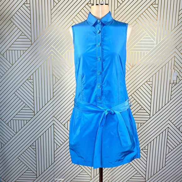 Adam Lippes Adam Plus Eve Blue Sleeveless Shirt Dress. Sleeveless mini dress featuring collared neckline with buttons down the front. Shiny blue and silver buttons. Drop waist with tie belt waist. Swishy material. Side hip pockets. Hidden side zip. Made in USA.
