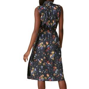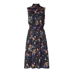 Black floral printed crepe (100% Polyester). Blouson. Sleeveless. High Neckline. Exposed front button closure.