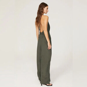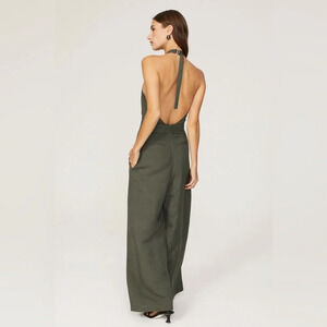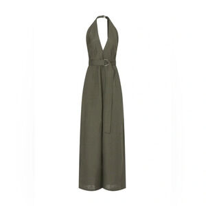 Elegant olive jumpsuit with halter neckline. Wide-leg design. Perfect for sophisticated occasions.