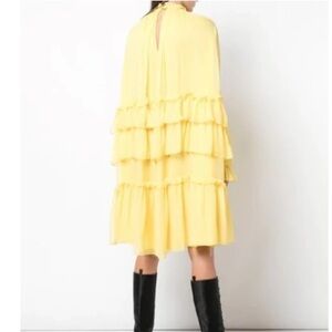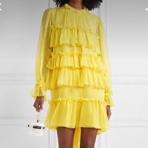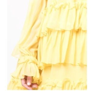 Worn once yellow silk chiffon ruffle mini dress from designer Adam Lippes. Super light and airy- very comfortable. Flowy and romantic. Sleeves are lightly sheer but the body is lined. Slightly mullet style with the back slightly longer than the front. One small pull in front but not super noticeable