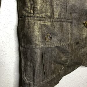 Adam Plus Eve Adam Lippes gold bronze metallic linen jacket. Collared with button front. Button flap chest and bottom pockets. Button cuff sleeves. Unlined. Brand tag has been removed. Size 6. Good preowned condition. One small spot on front. Minor imperfections in fabric from linen.