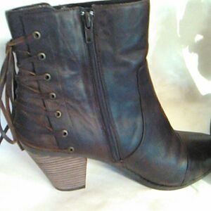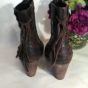 Style:Peru. Great boots with laces up the back for a rustic look. Wood grain heels, Distressed leather had variations in color, see photos. Inside zip. Soft lining, padded footbed. Photos are part of description. Size 10 measures 11.25 long, 4 wide, 3 5/8 high. Like NEW.