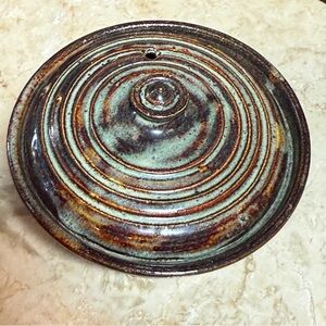 Beautiful handcrafted ceramic bowl with lid. Features a unique blend of earthy tones.