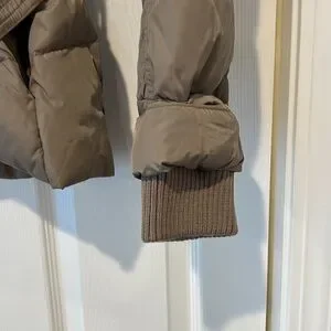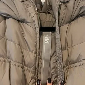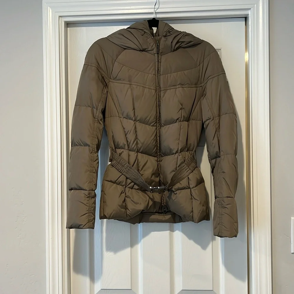 Add down jacket in excellent condition. Belted jacket with hood. Front pockets have zippers and snaps and sleeves have cuffs under the outer part (pictured)
