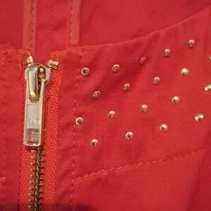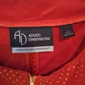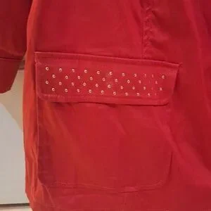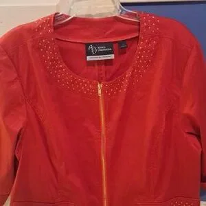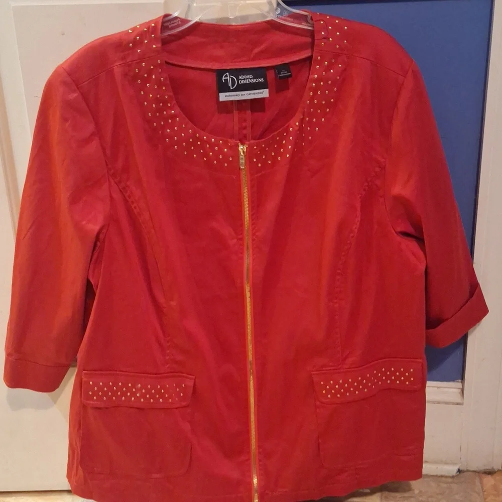 Added Dimensions jacket with studs and front pockets. Front zipper. 25.5" pit-to-pit without stretching laying flat. Has some stretch.