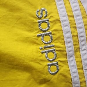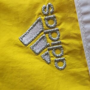 Bright yellow addidas baggy cropped workout / casual pants with white stripes, & silver embroidered logo. Size Medium, 14" across waist, 24" across hips, 20.5" inseam, 11.5" rise fr, 15" rise bk. Elastic waistband with adjustable elastic draw cord & nice size functional pockets. 100% polyester. Only worn a few times, good condition. Teeny, tiny, barely visible speck (see pics) that you may be able to get out if you have easy access to laundry (pants have never been in the dryer so it is not set in fabric). Great for visibility on early or late jogs, classes, workouts at the gym, or just comfortable casualwear.