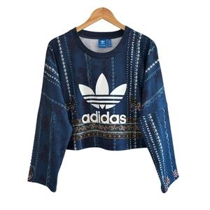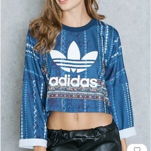 Vibrant blue crop top with unique patterns. Features classic adidas logo. Ideal for casual outings.