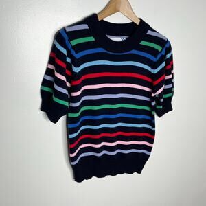 Addison Bay Short Sleeve Locust Sweater Womens XS Navy Rainbow Stripe Colorful