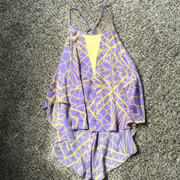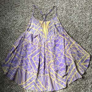 Addison asymmetrical high-low flowy tank top with purple and yellow pattern. Yellow V color block detail at front. Strappy details to bronze ring at back.