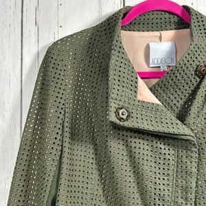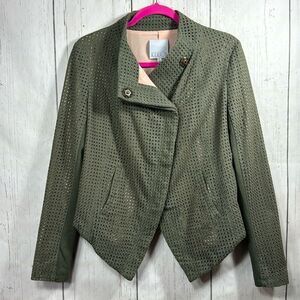 Addison Womens Asymmetrical Perforated Pockets Olive Green Snap Button Jacket