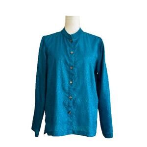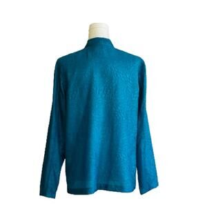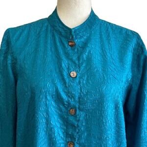 Chico’s Blue Teal Peacock Long Sleeve Button Front Lightweight Crinkle Embossed Blouse Top