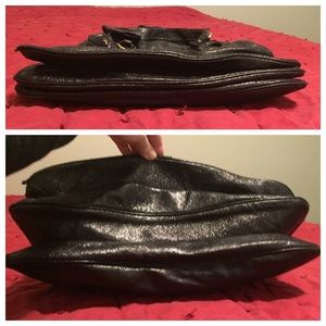 Photos of my actual bag! As you can see, it looks quite different empty than it would in use- hence the stock photos ☺ Beautiful black crinkle leather with gold-tone hardware. Top zip closure with oversized pull. Raised zip pockets at front & rear with handle attachments. Printed fabric lining with back wall zip pocket, multifunctional slip pockets, & center zip divider. Dust bag. Perfect for the woman who carries around her life! Made in U.S.A. Feel free to ask for additional info/photos ❤️