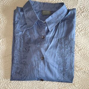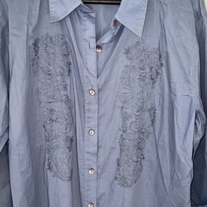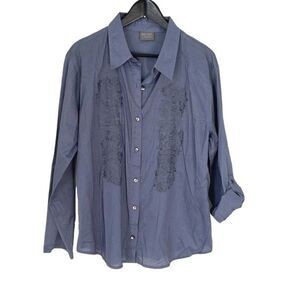 Additions By Chico's Womens Button Down Shirt Roll Tab Long Sleeve Embroidered Stitching Detail Floral Blue Size 3. Collared Neckline Casual Work Travel.
