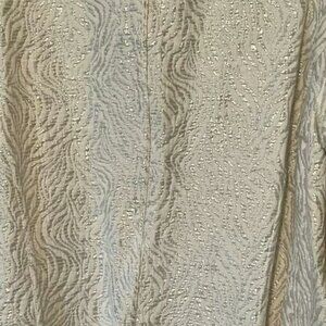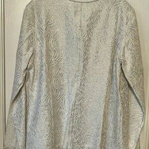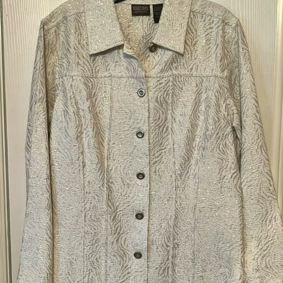 Gorgeous Additions by Chico‘s lightweight long sleeve jacket, size 2 in Chico’s, which is a regular 10 to 12. Never worn with tags. Very elegant with silver thread design in jacket.