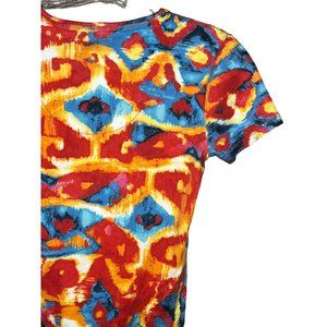 Additions by Chicos women's top, multicolored with a mix of orange, red, and blue. V-neck short sleeve with a stretchy fit, made in India. 100% cotton with a chest size of 16, length 21, and sleeve size from center back 12.