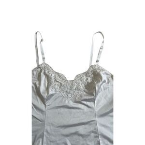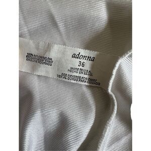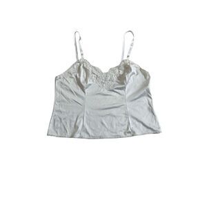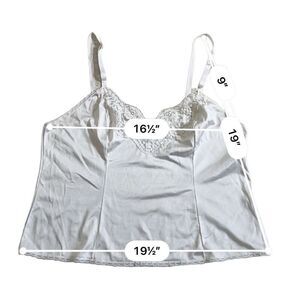 This is a new, white, Adonna brand, sleeveless, lace-trimmed camisole. It is made of 100% nylon and has a scoop neck. The camisole measures 19 1/2 inches across the bust, 16 1/2 inches across the waist, and 19 inches in length. The straps are adjustable and measure 9 inches in length. The camisole is in new condition without tags.