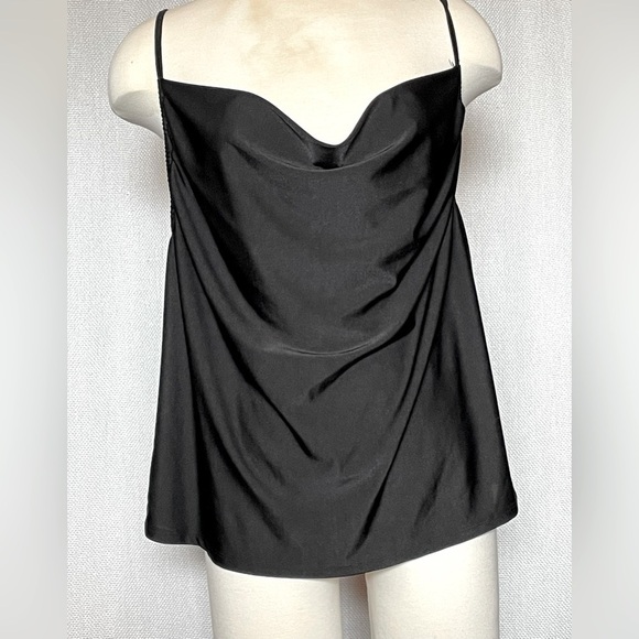 Black. Top section of front is double fabric. Self tie in back is adjustable for perfect fit. Great alone or under jacket or cardigan!