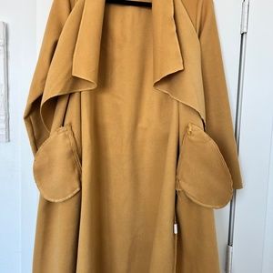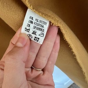 I am 5'5" and it hits just below the knee. Fabric is soft and not too thick and not too heavy. Bought in Rome. Color is mustard yellow.