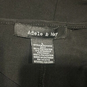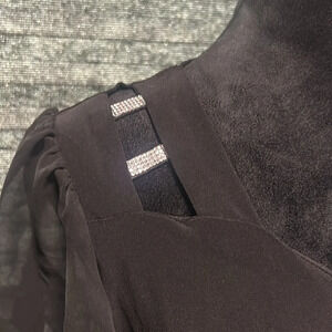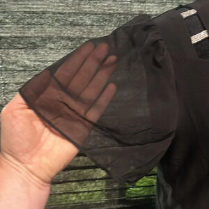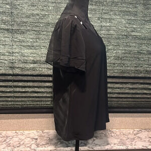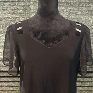 Adele & May women’s black short sleeve blouse. Sheer sleeves. Rhinestone shoulder accents. Poly/spandex blend. Size Large